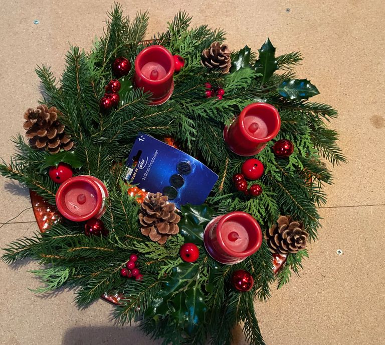 Kranz aus Echttanne mit Zapfen, Kugeln und elektrischen Kerzen auf Telller