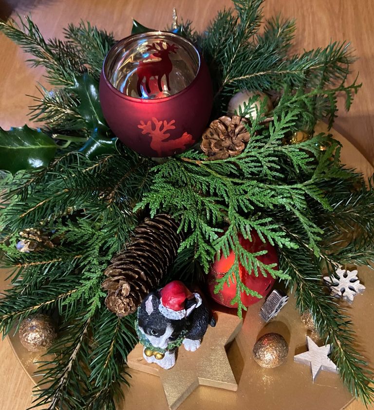 Weihnachtliches Gesteck auf Teller mit Echttanne und Katzenfigur
