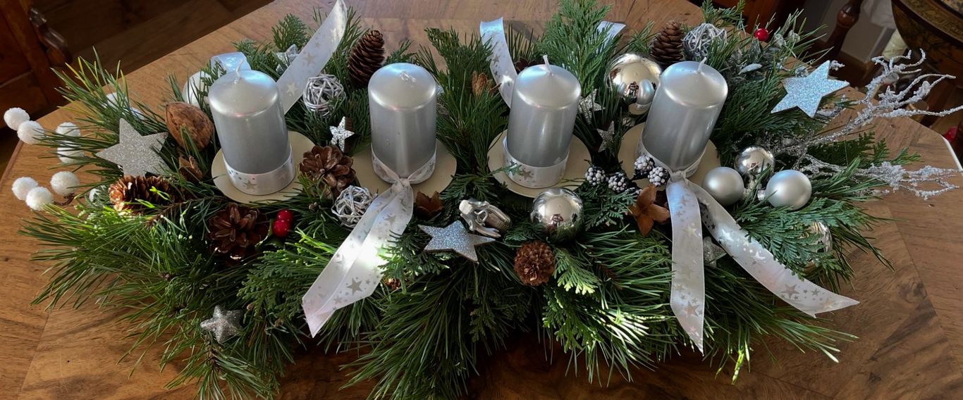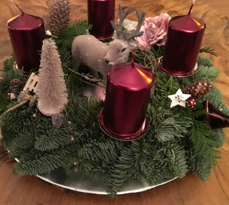 Hier stelle ich Ihnen einige Beispiele an weihnachtlichen Kränzen und Gestecken vor. Sie könne Ihre Wünsche zwecks Material und Kerszen sowie Größen frei wählen.