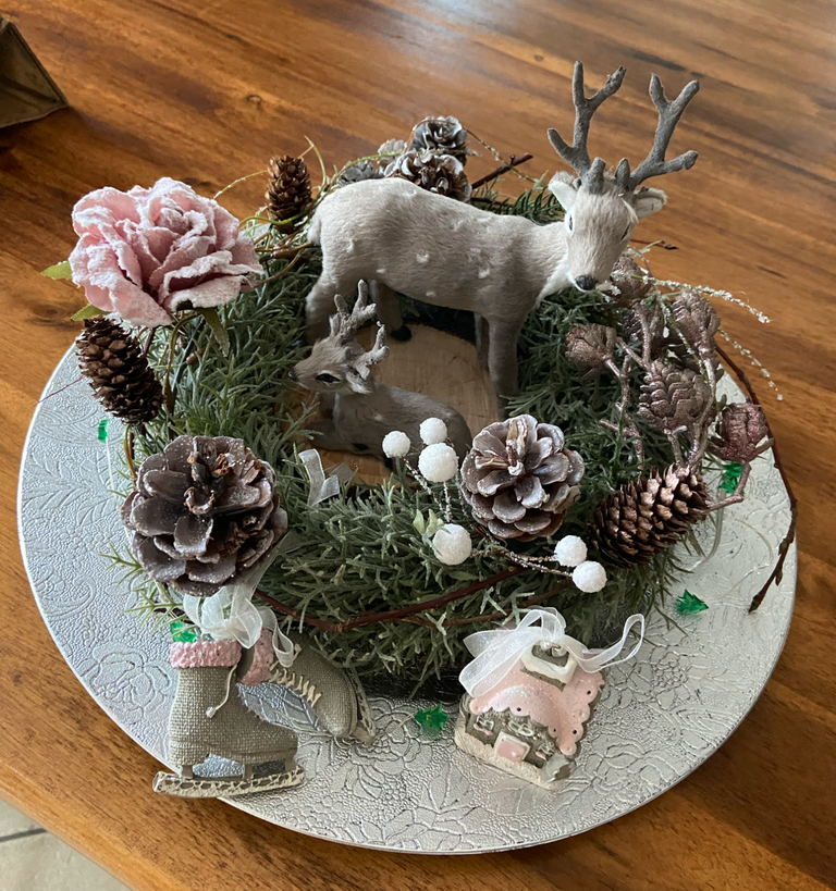Kranz aus Echttanne mit Figuren, Kugeln und Kerzen auf Telller mit hochwertigem Hirsch in der Mitte